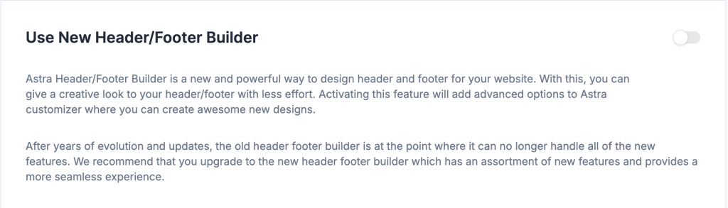 If the old Header is currently active, you’ll see an option to switch to the New Header Footer Builder. If this option is not visible, it means the New Header Footer Builder is already enabled.
