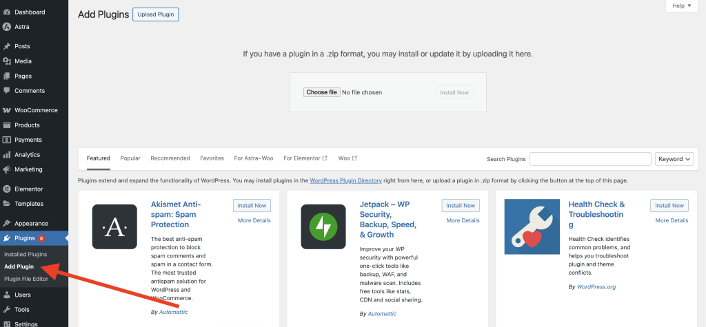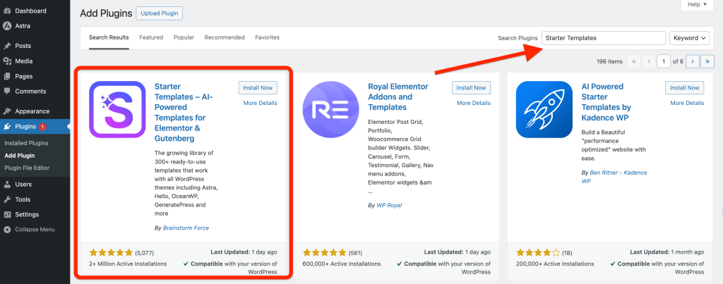 After installing and activating the Astra theme, follow these steps to access and install the Starter Templates plugin: