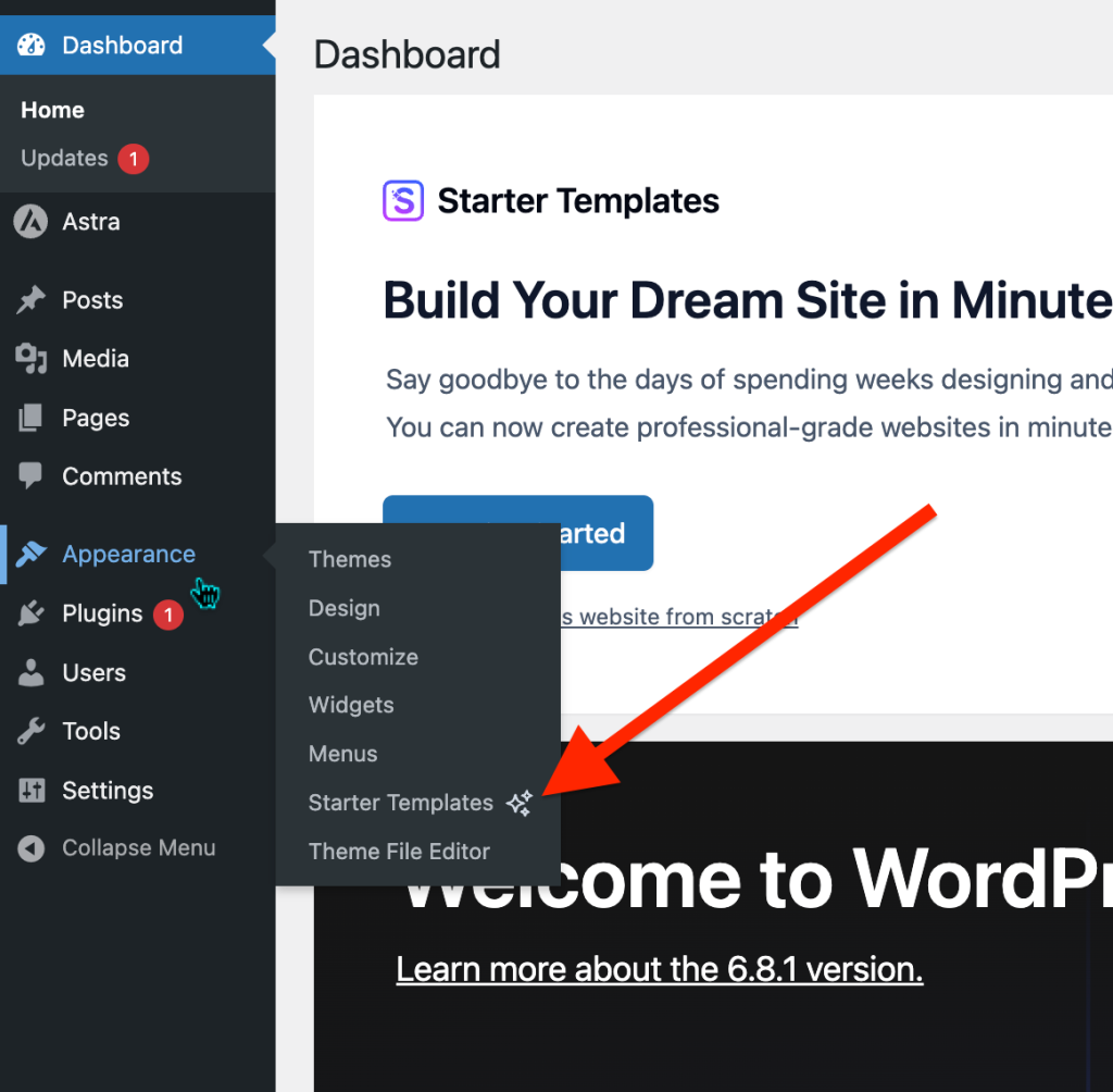 - You can find Starter Templates under Appearance > Starter Templates once it’s installed and activated.