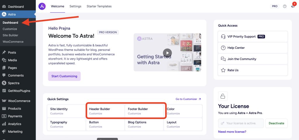 Once you have the Astra theme installed go to Astra welcome page under Astra > Dashboard. Here under Quick Settings, you can see Header Builder and Footer Builder.