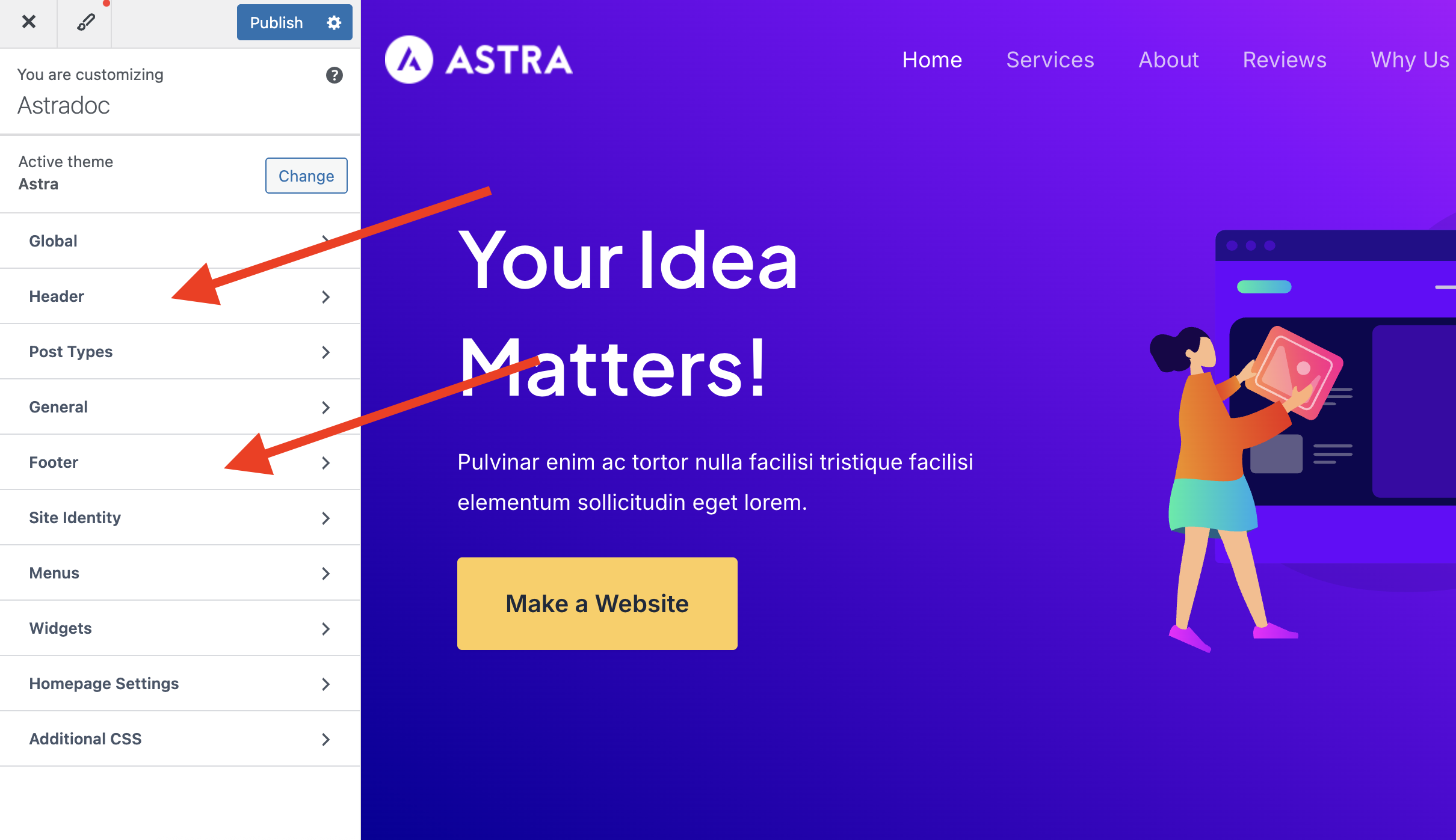 Then visit customizer by clicking on Go to Customizer. Once you are in the customizer you will see new options for Header and Footer.