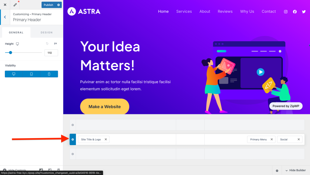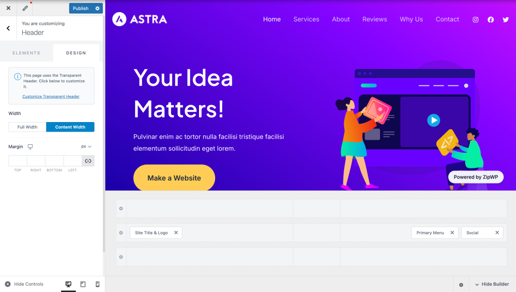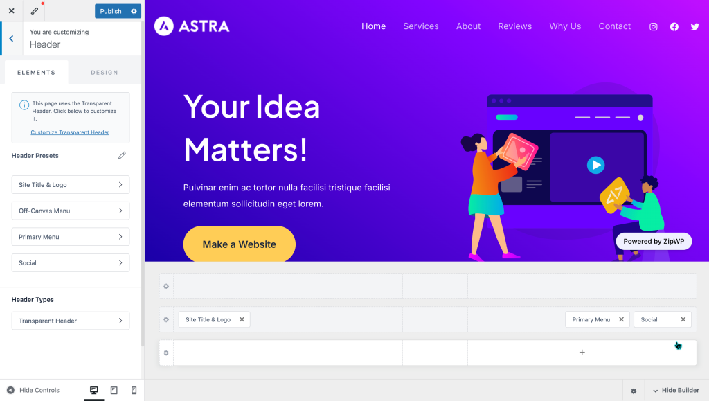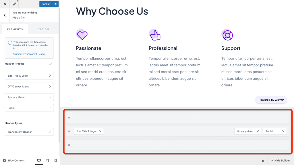 The rest of the screen will show a live preview of your header and the position of your elements across header sections.