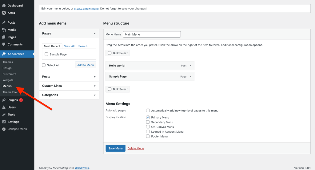 Here, you will find menu items added to your Primary Menu (WordPress Dashboard > Appearance > Menus).