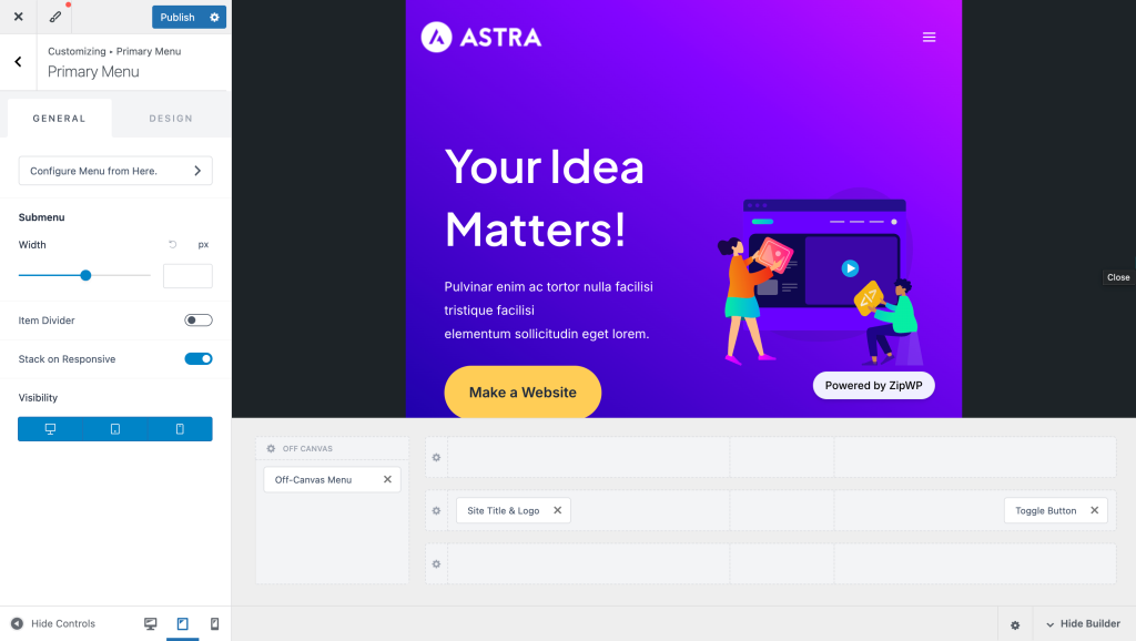 The Off Canvas section is used to edit your tablet/mobile menu. This menu is activated by clicking on the Toggle Button in the mobile menu (also called the “hamburger” menu).