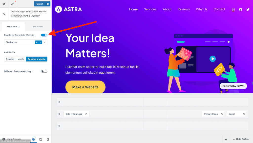 Click the “Enable on Complete Website” option to enable the transparent header. This will also open up additional options to disable the Transparent Header for a specific page or post type.