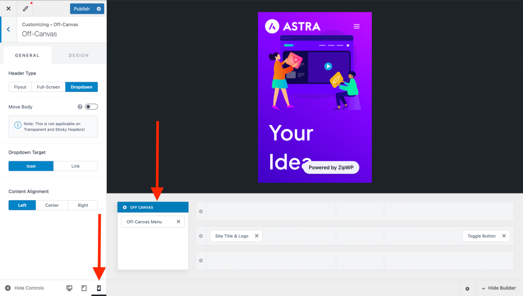 - Content Alignment – align the Off Canvas section widgets to Left, Centar, or Right;