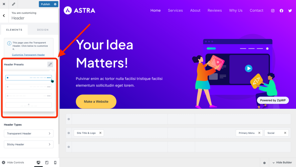Astra makes it easy to design headers with ready-made presets. You can select one of these instead of making a header from scratch. This saves you valuable time and effort.