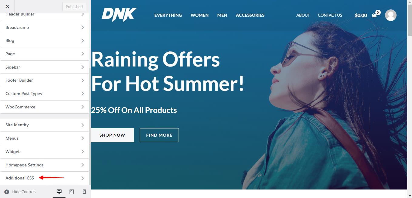 Step 2: Click on the Additional CSS option at the bottom of the Customizer