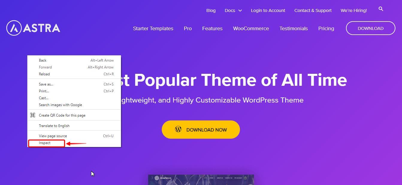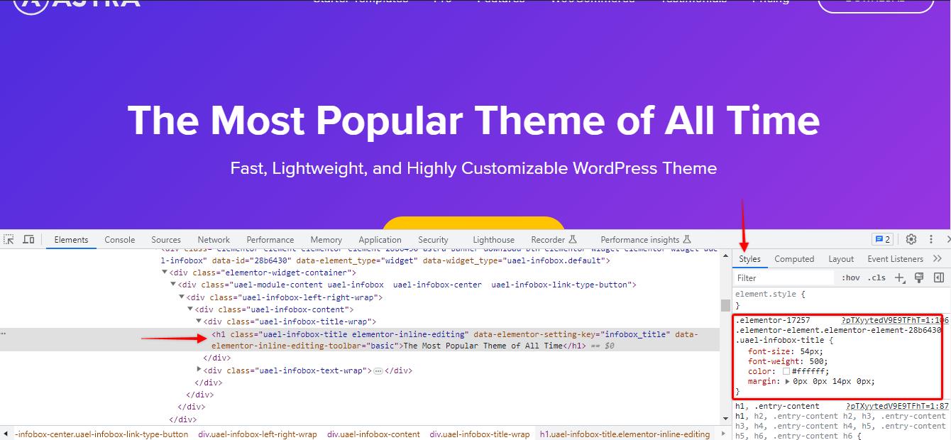 In this example, we would be changing the header CSS for the Astra theme home page. You can follow the steps below to inspect and change any CSS properties for any website of your choice.