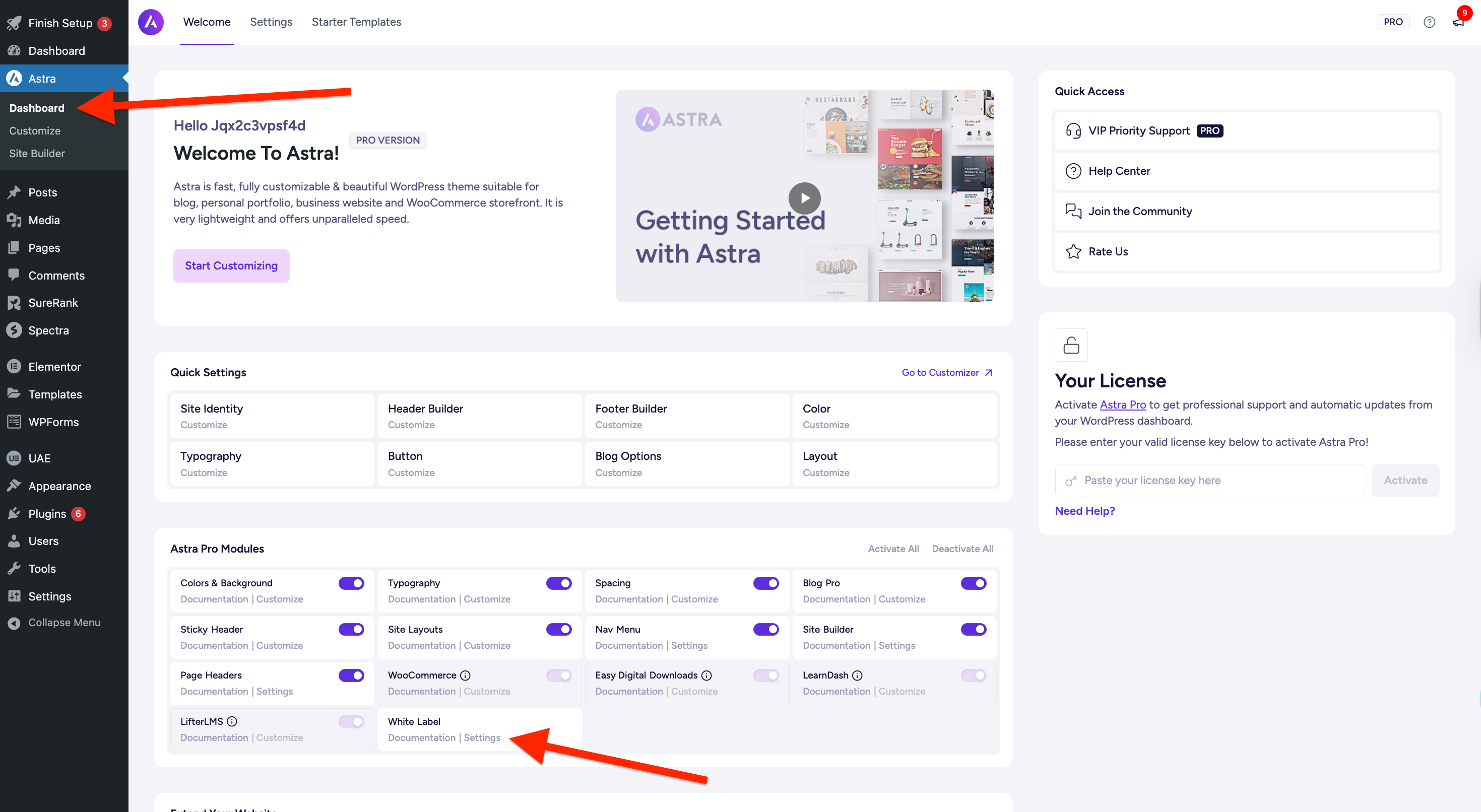 In order to edit the Astra Pro white label settings, you will need to click on the “Astra” option on your WordPress Dashboard, then click the settings option under the White label and add all necessary details in the fields given.