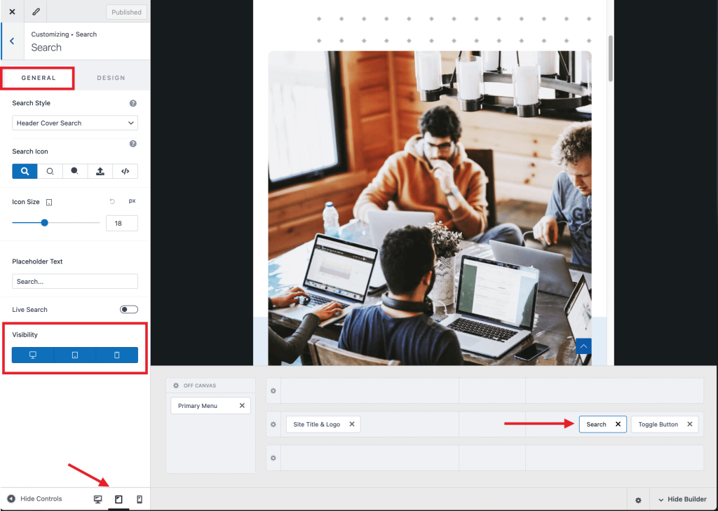 Step 3 – Switch to Tablet preview either by clicking on any responsive icons on available options or the Table Icon at the bottom of the Customizer.