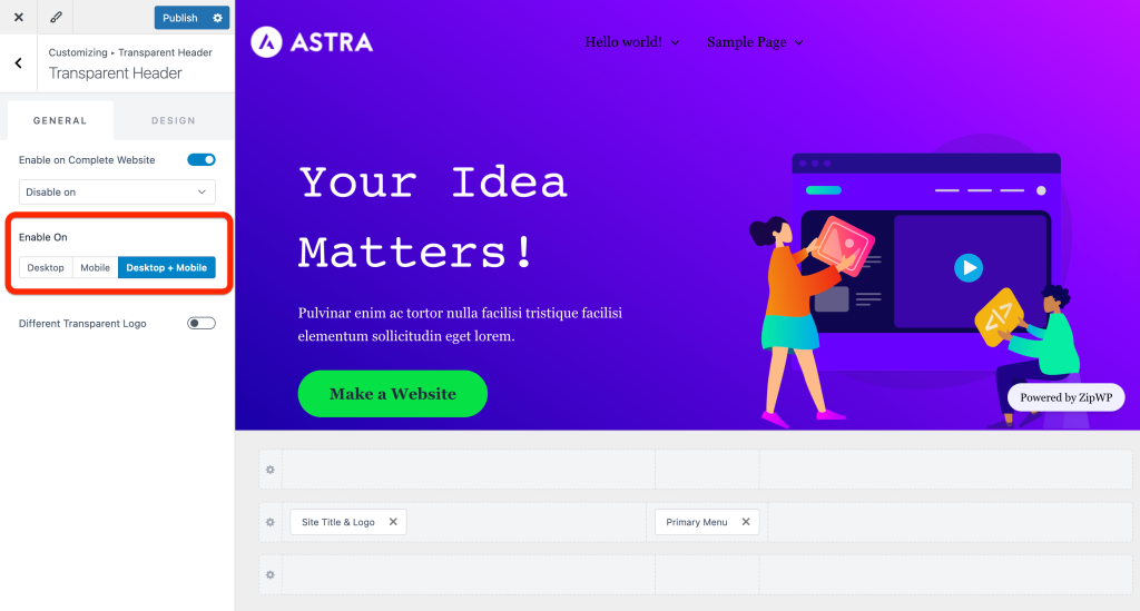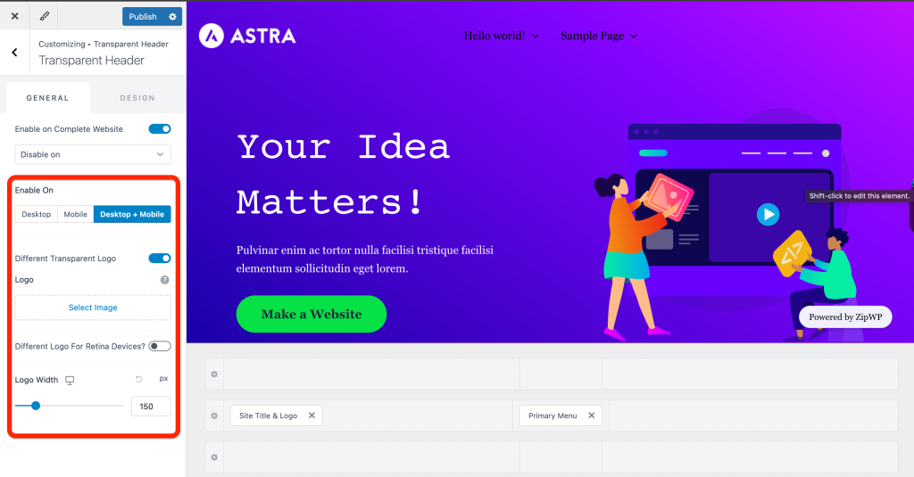 - Under the Transparent Header section, you can Enable it on the complete website for Desktop or mobile or Dektop+Mobile. Also, you can set a different logo and logo width here.