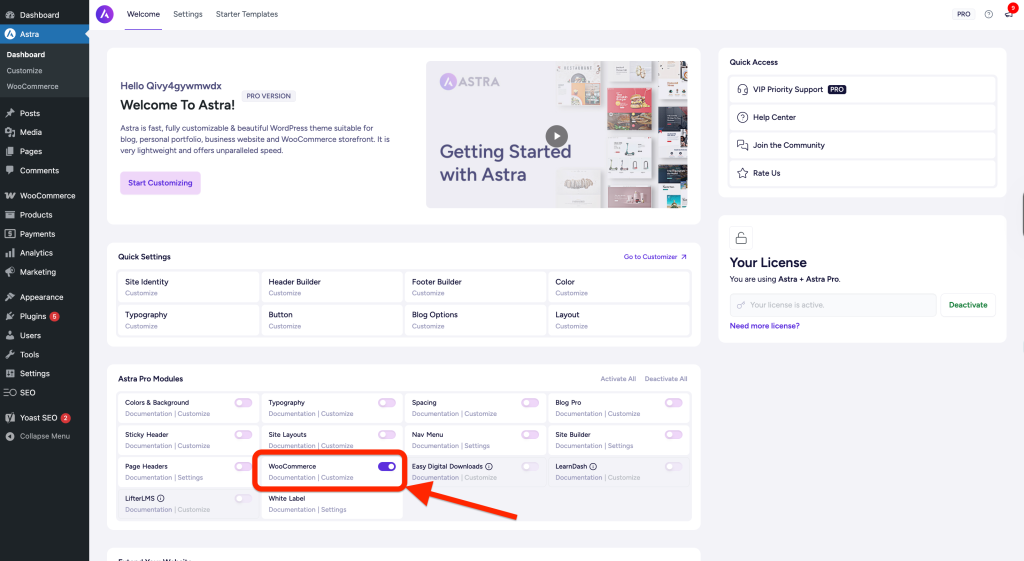 Step 2: Activate the WooCommerce module from Astra > Dashboard > Astra Pro Modules.
